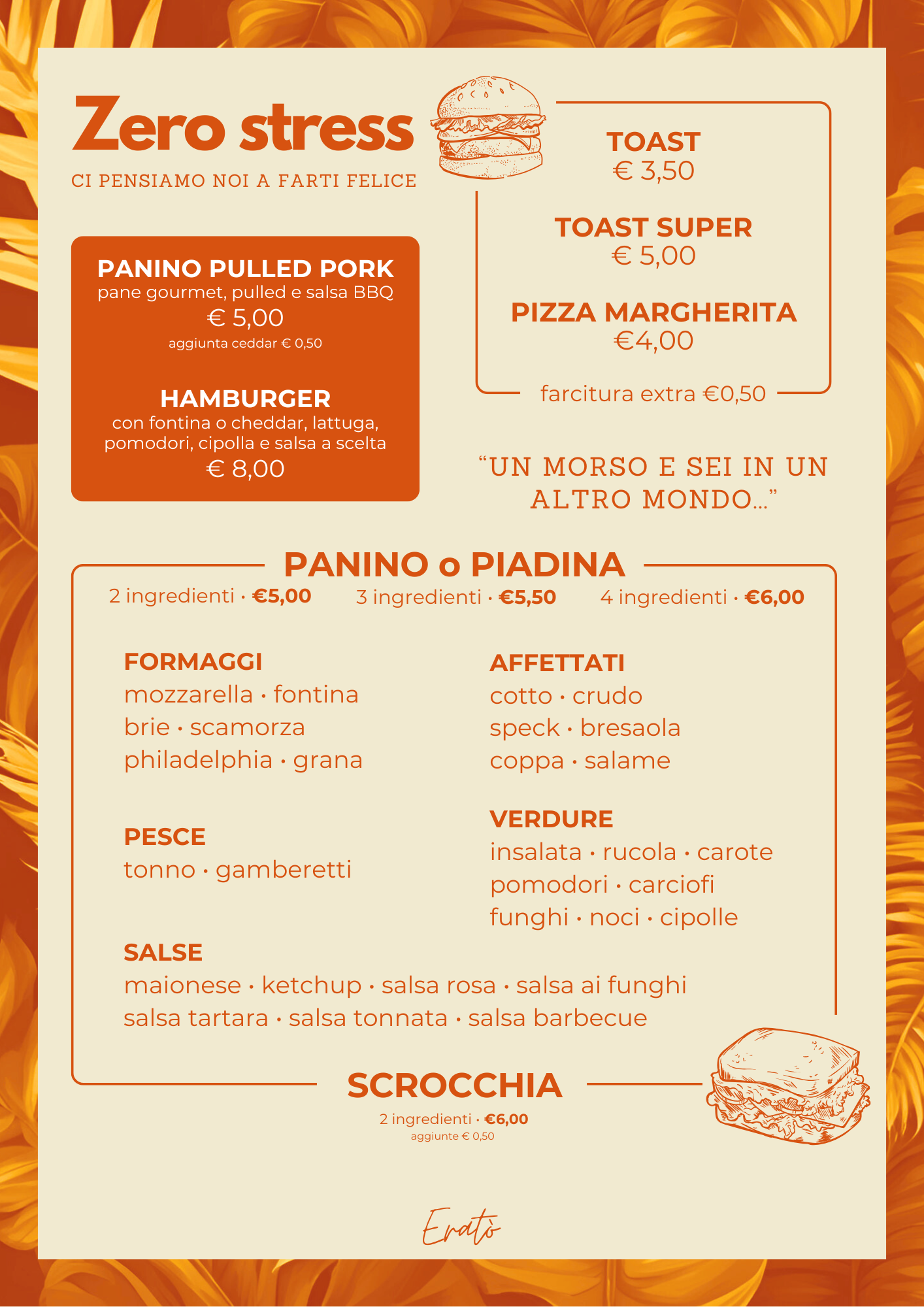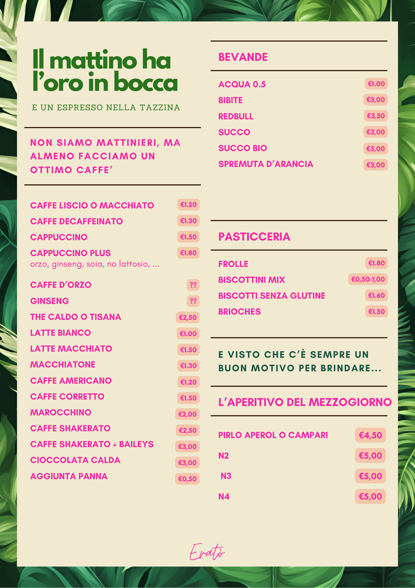 Inizia la tua giornata con energia e gusto grazie alle nostre colazioni deliziose. Che tu preferisca un croissant con un caffè espresso per un dolce risveglio, o un toast e una spremuta per trovare la giusta energia, abbiamo tutto ciò che ti serve per partire col piede giusto.
